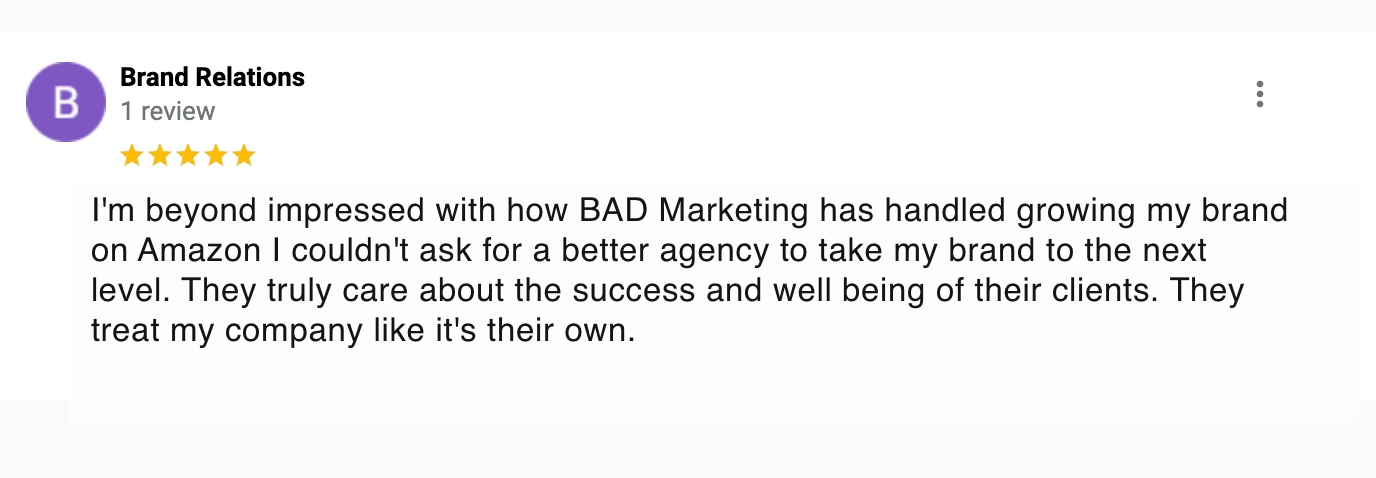 Sure, there are cheaper options, but our pricing directly reflects the quality and expertise we’ll apply to your brand. BAD Marketing operates more like your outsourced Amazon department: strategy, PPC, listing optimization, compliance, design, and launch; all managed by specialists. Our retainers reflect the depth of that work and the growth we consistently deliver. You’re not paying for hours — you’re paying for outcomes.